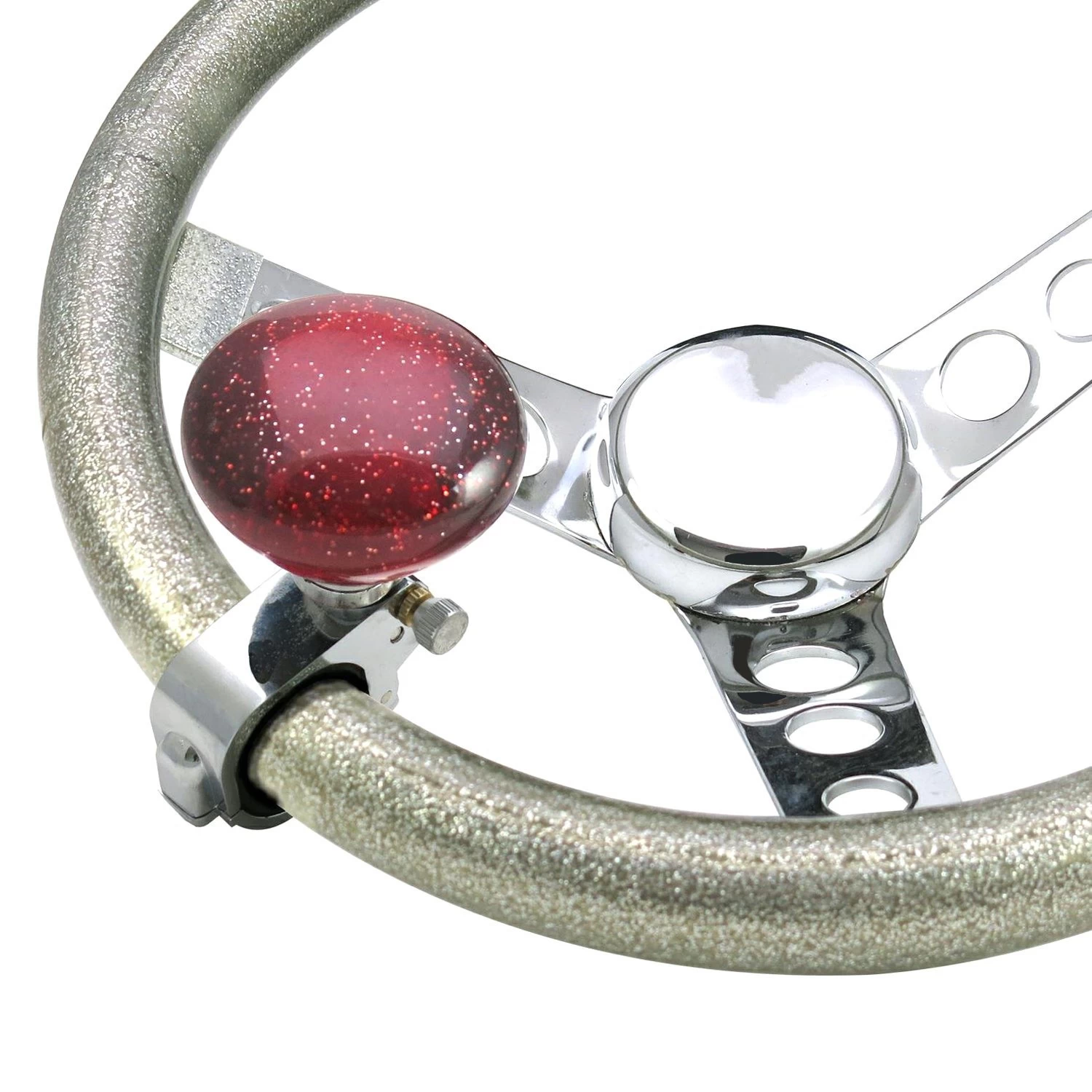 Universal Retro Series Adjustable Suicide Brody Knob (ASCBA10007) by American Shifter®. Color: Translucent Red With Metal Flake. Type: Adjustable Pivot Design. What ever you call them, American Shifter® got you covered with the world largest selection of steering wheel knobs. Each knob uses the highest quality materials, and craftsmanship to deliver the smoothest operation. From authentic billiard balls, to hand painted limited edition steering wheel knobs you can count on the craftsmanship like no other. Each steering wheel knob has a matching shift knobs to dress up your vehicles interior in style!