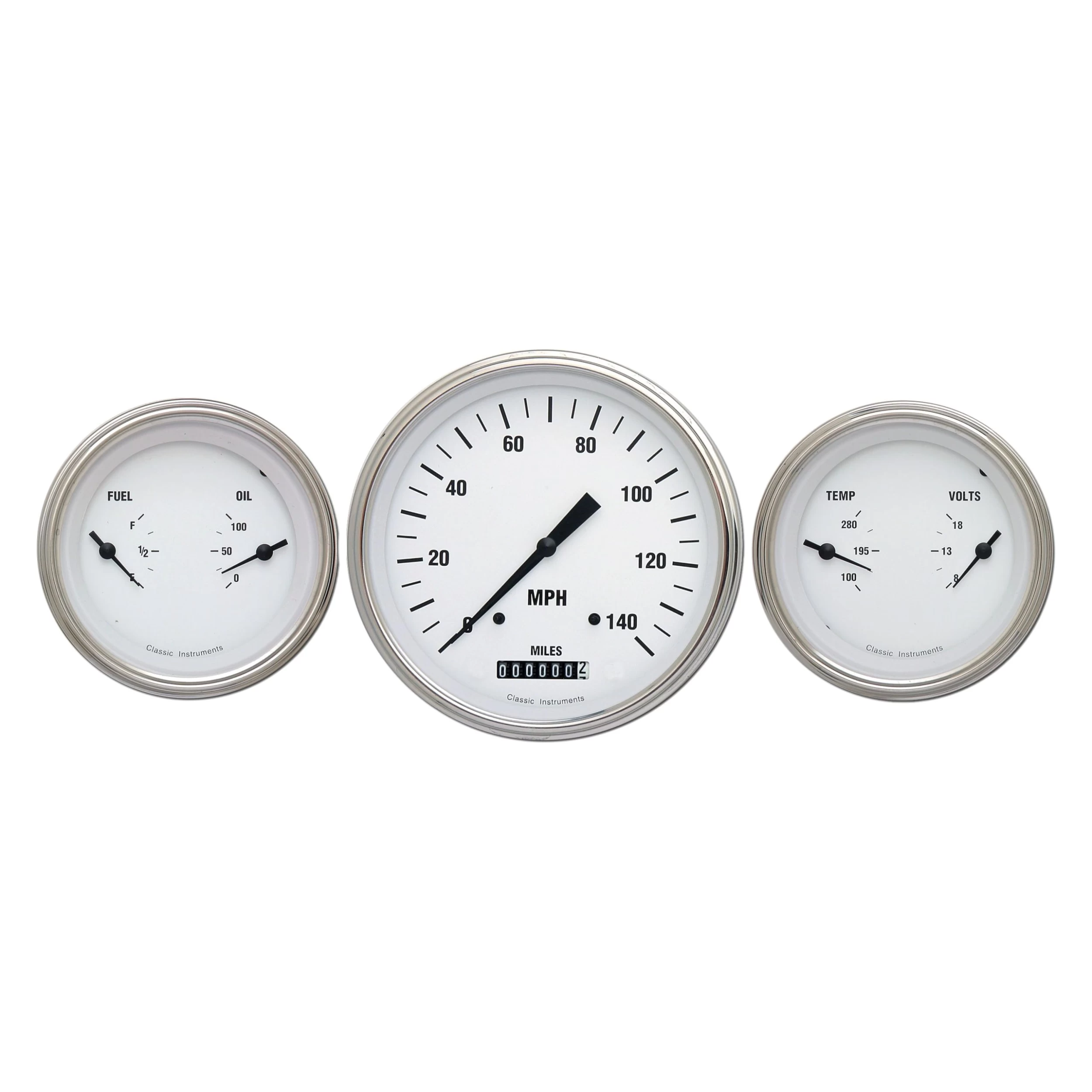Universal White Hot Series Custom 3-Gauge Set (WH64SLC) by Classic Instruments®. Main Gauges Diameter: 4-5/8″. Type: Speedometer/2 Duals. Bezel Type: Stainless Low Step. Lens Type: Curved. Speedometer Type: W/O Built-In Tachometer. This top-grade White Hot Series Gauge Set by Classic Instruments is expertly made in compliance with stringent industry standards to offer a fusion of a well-balanced design and high level of craftsmanship. Manufactured from industry-leading materials using up-to-date equipment, it ensures everlasting reliability and enduring value. With new and original designs to meet the unique needs of the automotive enthusiast, Classic Instruments continuing research and development assures its customers of always having the finest in design, quality, technology, and good looks available to the hot rod customer.