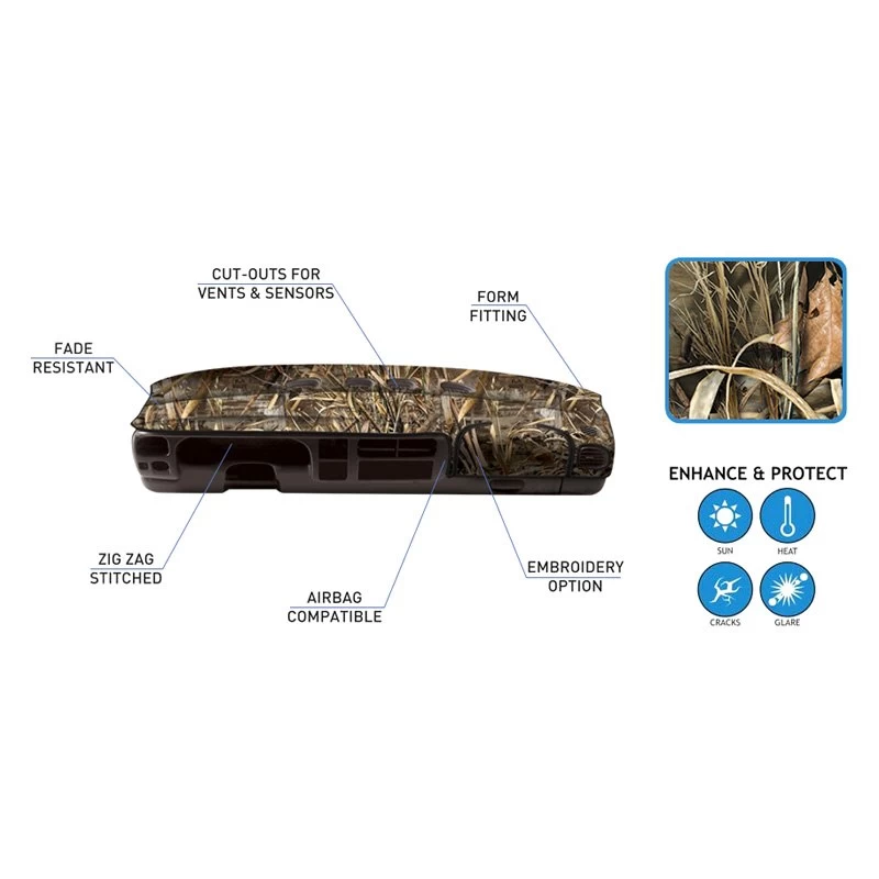 Velour Custom Dash Covers now comes with three unique designs from RealTree™. Add style to your existing dashboard while also protecting the dash from the heat of the sun. Made from durable velour felt, the velour dash cover gives your interior a vibrant plush look. Coverking’s top of the line velour is custom manufactured using unique zigzag stitching allowing the best fit for your vehicle. Coverking’s covers come standard with all cutouts for airbags, sensors or other accessories on your car. Polyester material with velour finish, that they’re made of, will add as much feeling of comfort and dash protections, as the stylish looks.