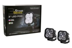 Universal Stage Sport Series Flush Mount 3″ 2×14.5W Square Flood Beam LED Lights, With White Backlight (DD6915P) by Diode Dynamics®. 1 Pair. White light. 9-16V. 1.1A. Raw lumens: 1520; Effective lumens: 2262. 6000K. Add LED pods to your bumper, truck bed, or anywhere else you can think of with SS3 Flush Mount Pod Kit! Featuring higher output intensity than any other 3″ light on the market, these LED pods have been designed for maximum functionality, with custom-engineered TIR optics shining in highly useful beam patterns, all in a durable package.