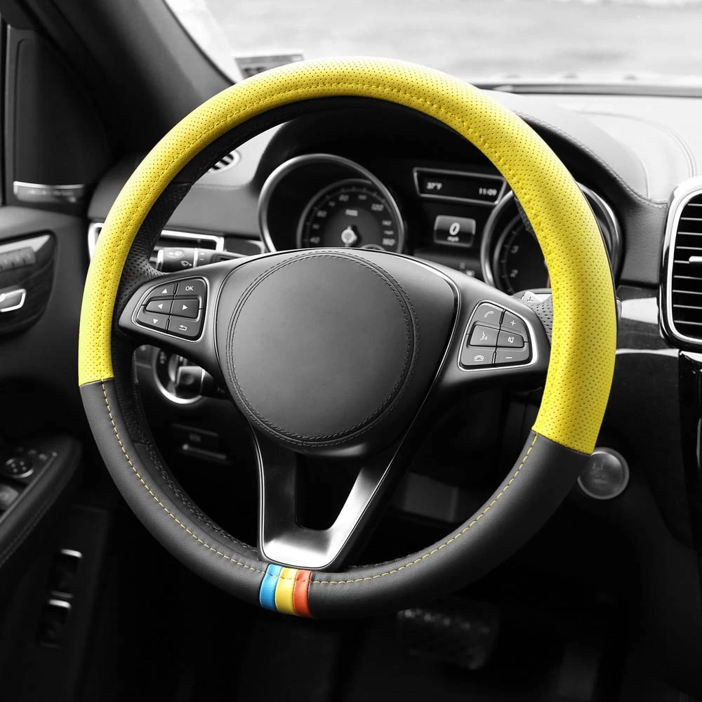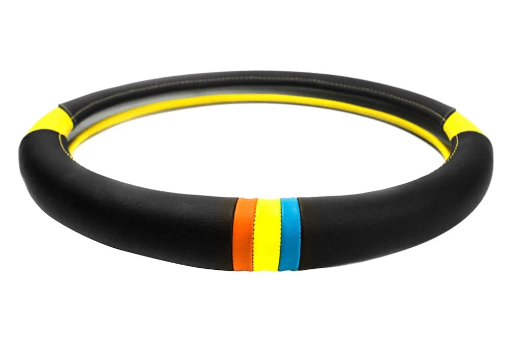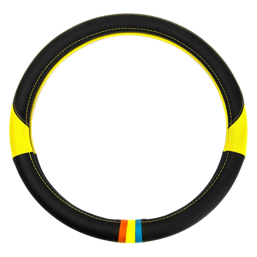 Full Spectrum Genuine Leather Yellow Steering Wheel Cover (CIFH2008-YELLOW) by FH Group®. Protect your steering wheel and give it a facelift with a design that combines classic black genuine leather with bright, vivid colors. Your favorite color wraps around the perimeter while a spectrum of colors anchors the bottom of the steering wheel cover, and matching stitching brings it all together.