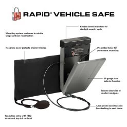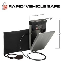 Universal RAPiD™ 12V Vehicle Safe by Hornady®. The patent-pending mounting system of the RAPiD® Vehicle Safe features an inflatable bladder that conforms to a vehicle interior’s shape, making modifications to the vehicle unnecessary. Power is supplied by the included 12-volt car adapter or four AAA batteries (not included).