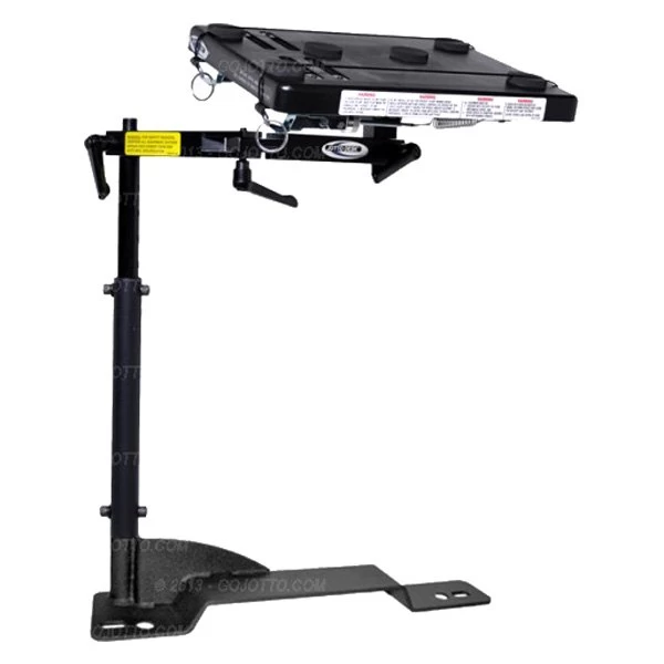 The patented Cable-DockĀ® securing system uses two thin nylon-coated steel cables that wrap up and over the keyboard section of the computer for a firm and positive grip. This securing system will give you peace of mind knowing that your laptop is secured. The laptop tray will rotate 360 degrees at the end of the articulated arm enabling you to easily fine tune screen viewing. Using an articulated arm, industry first feature allows you to sit and work comfortably in driver or passenger seat and store the computer screen up against dash while driving. The overall design of this Ford Van desk lets you to pull the desktop over for comfortable operation, reducing back strain. Stand height is adjustable and can be removed from No Holes Base in seconds when not needed. Field proven over the past 20 years the Jotto Desk offers mobile professionals the best rugged laptop mount. Made of recyclable materials, laptop workstation creates a proven mobile office for cars, trucks, vans, SUV’s and Big Rigs. Jotto Desk is easy to install, easy to set-up and easy to use. From individuals to fleets this pro desk will place your notebook at your fingertips when parked.