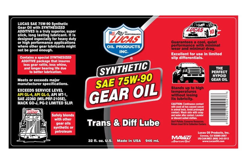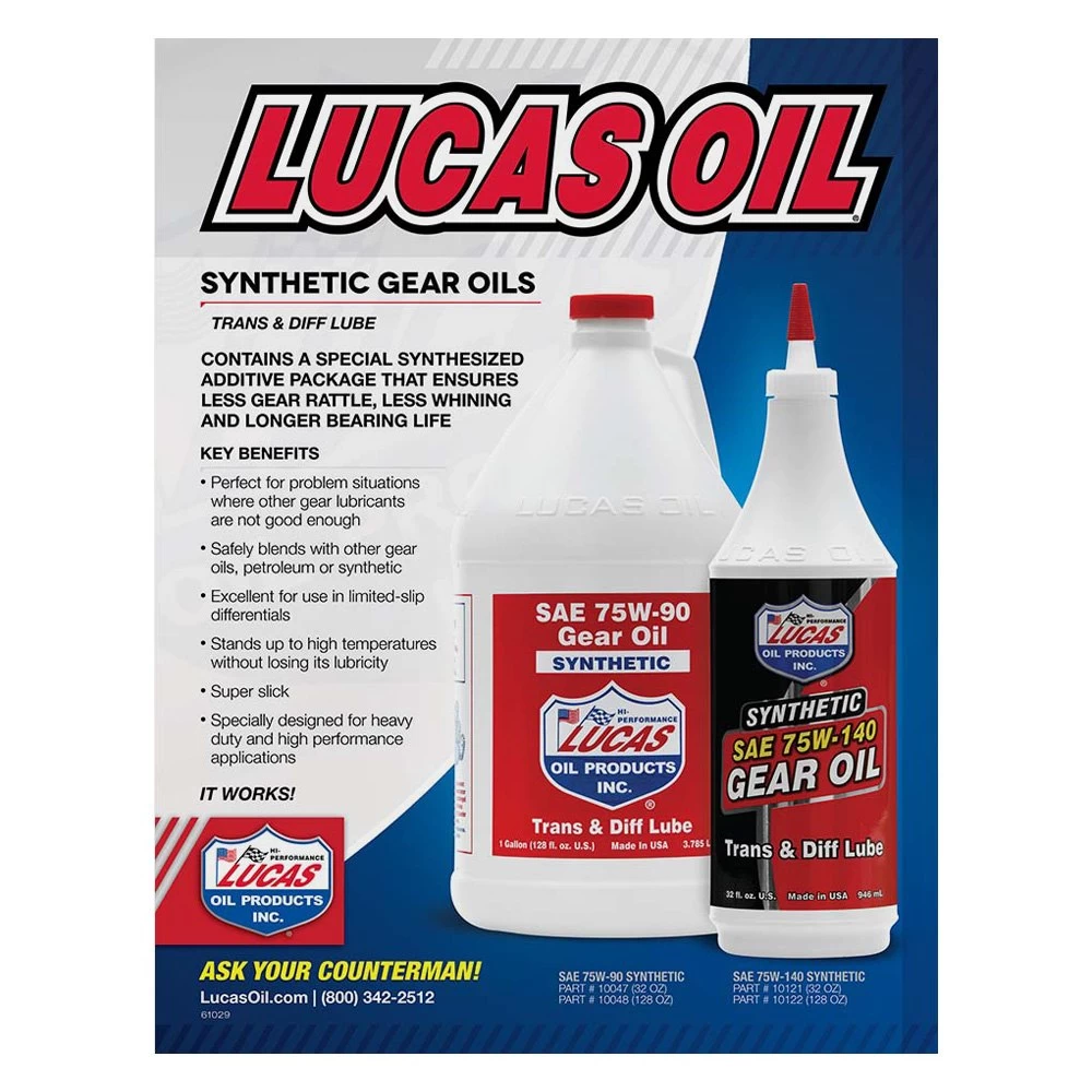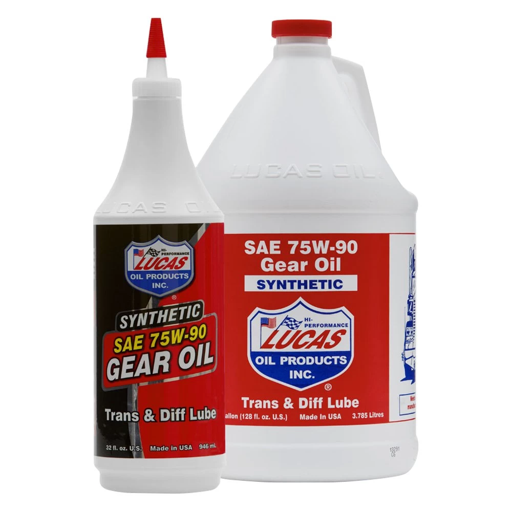 SAE 75W-90 Synthetic Gear Oil, 1 Quart by Lucas Oil®. Viscosity: SAE 75W-90. Oil Base: Synthetic. Volume: 1 Quart. Quantity: 1 Bottle. Lucas SAE 75W-90 Synthetic Gear Oil is a non-foaming, super slick, long lasting lubricant designed especially for heavy duty or high performance applications where other gear lubricants just aren’t good enough. Contains a special additive package that cushions gears and resists “squeezing out” under extreme pressure situations where other gear lubricants just aren’t good enough. Specially designed to stand up to high temperatures without losing its lubricity.