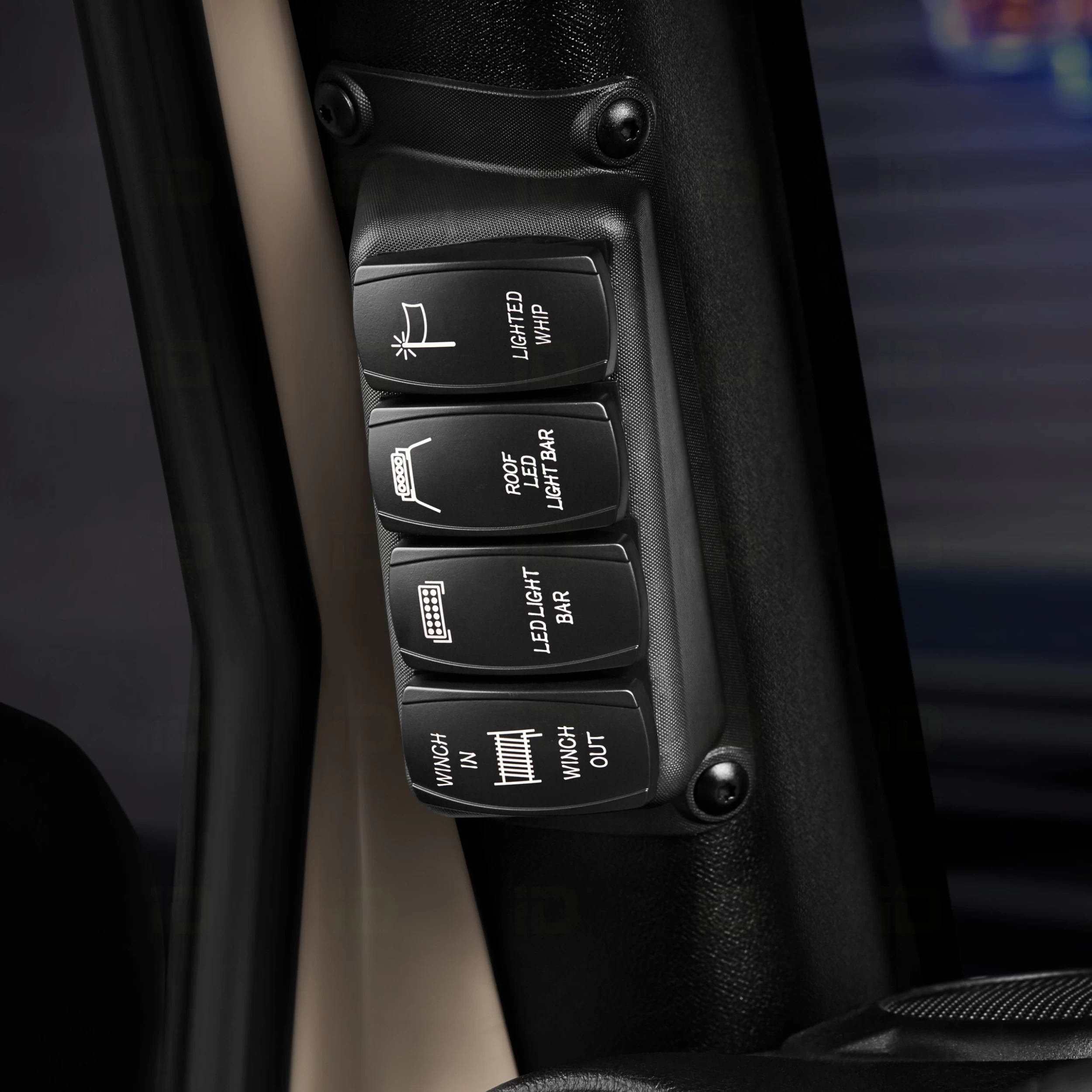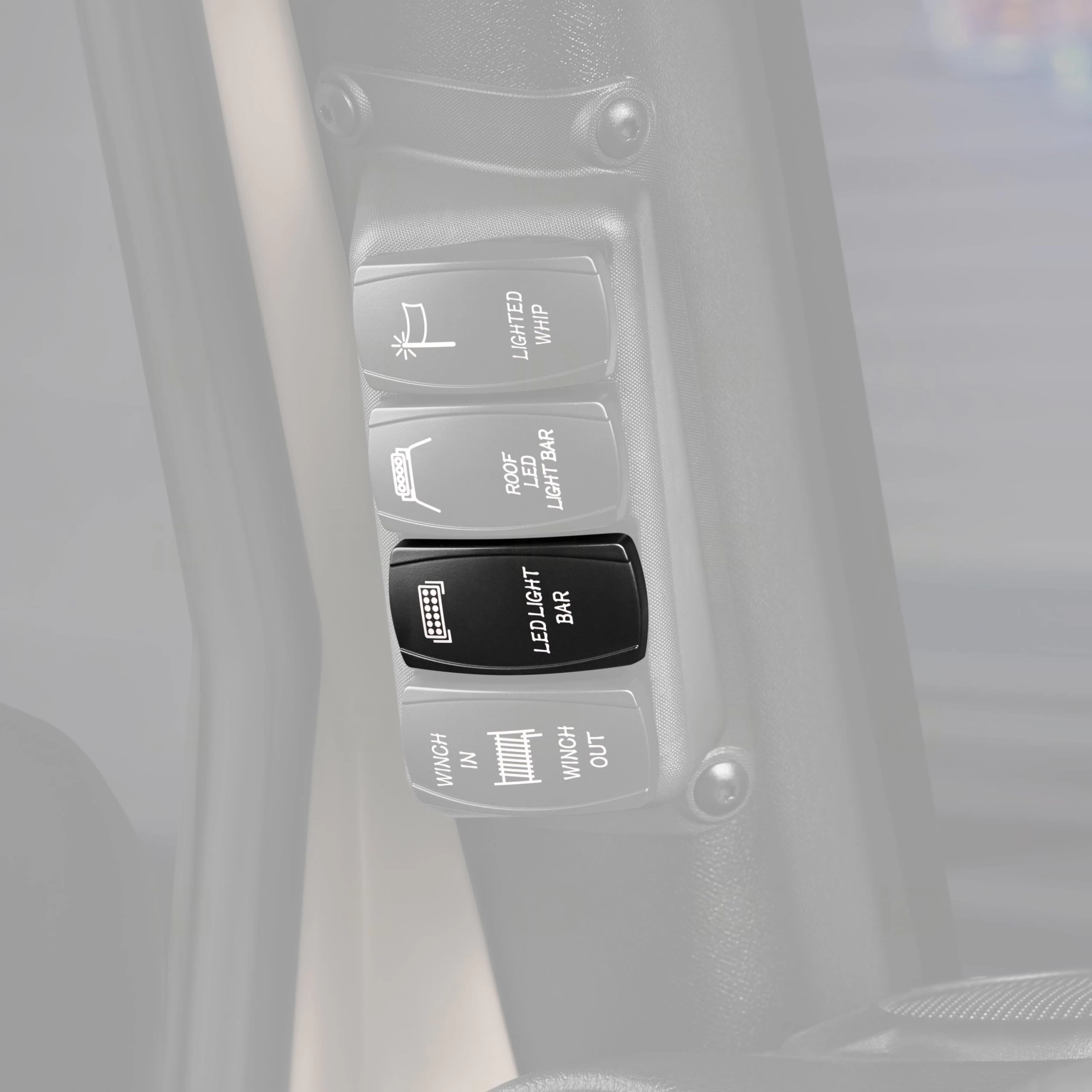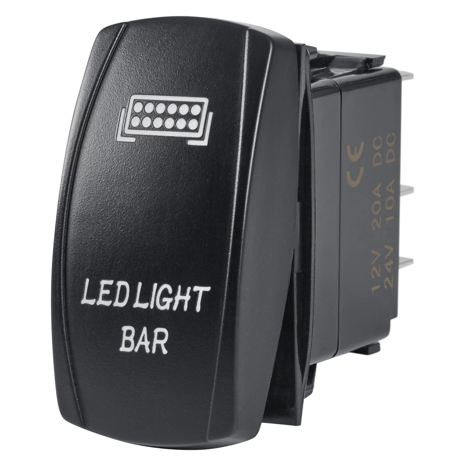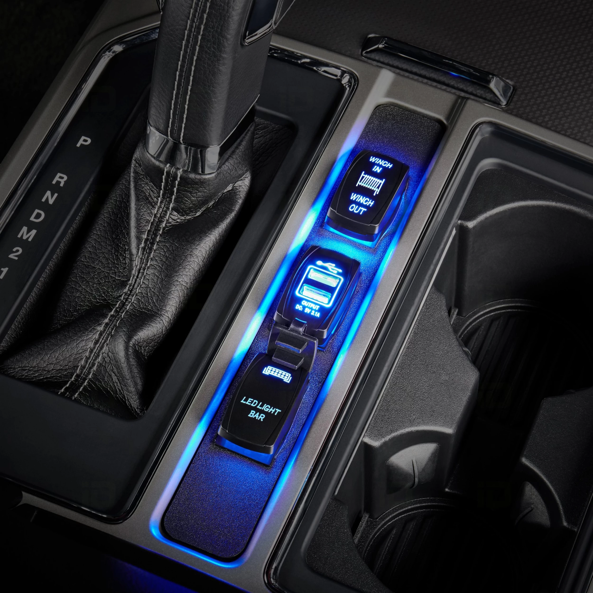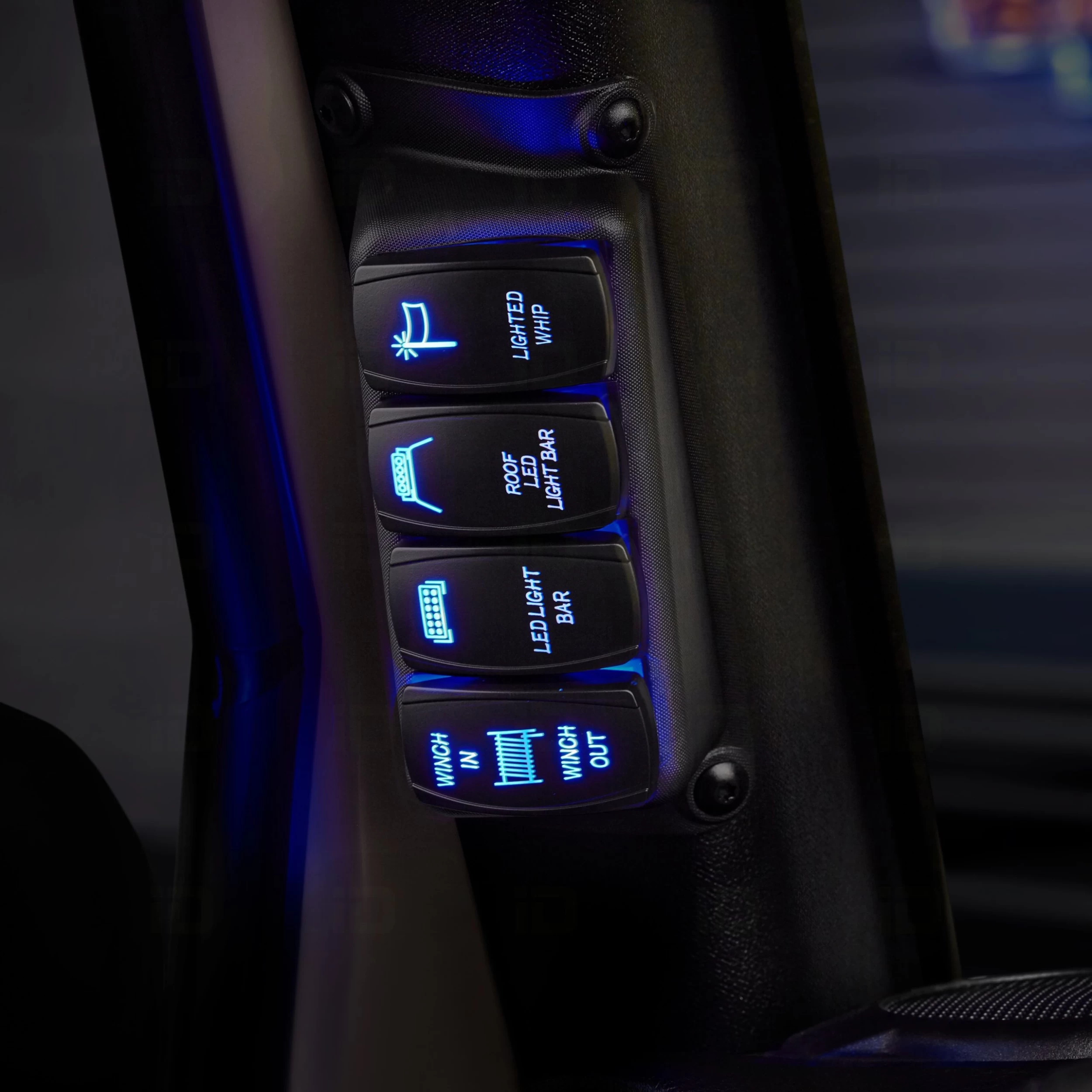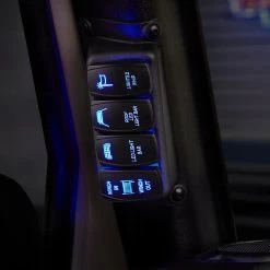 Universal Illuminated LED Rocker Switch (RSW011) by Lumen®. When you upgrade your vehicle’s lighting with super bright Lumen LED lights, go all the way and take your controls to the next level with Lumen Illuminated Rocker Switches. The cool blue light shines through text and symbol on the light face and we’ve got switches for light bars, fog lights, work lights, and much more. Standard DIN size means perfect fitment in factory and aftermarket switch panels.