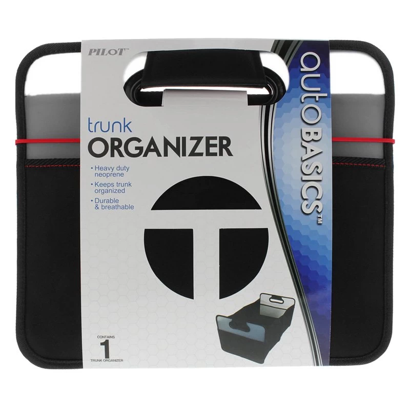 Universal Collapsible Trunk Organizer by Pilot®. Color: Black. Dimensions: 2.7″L x 14″W x 12.2″H. This trunk organizer allows you to add some style to your trunk while organizing and maximizing the amount of space available.