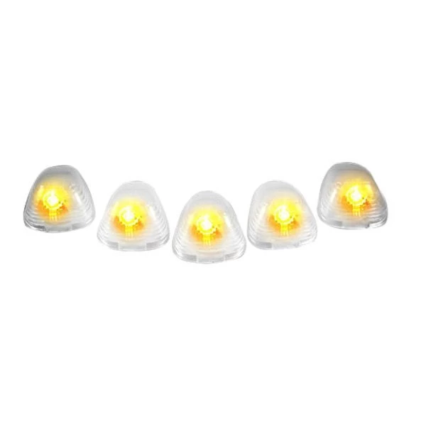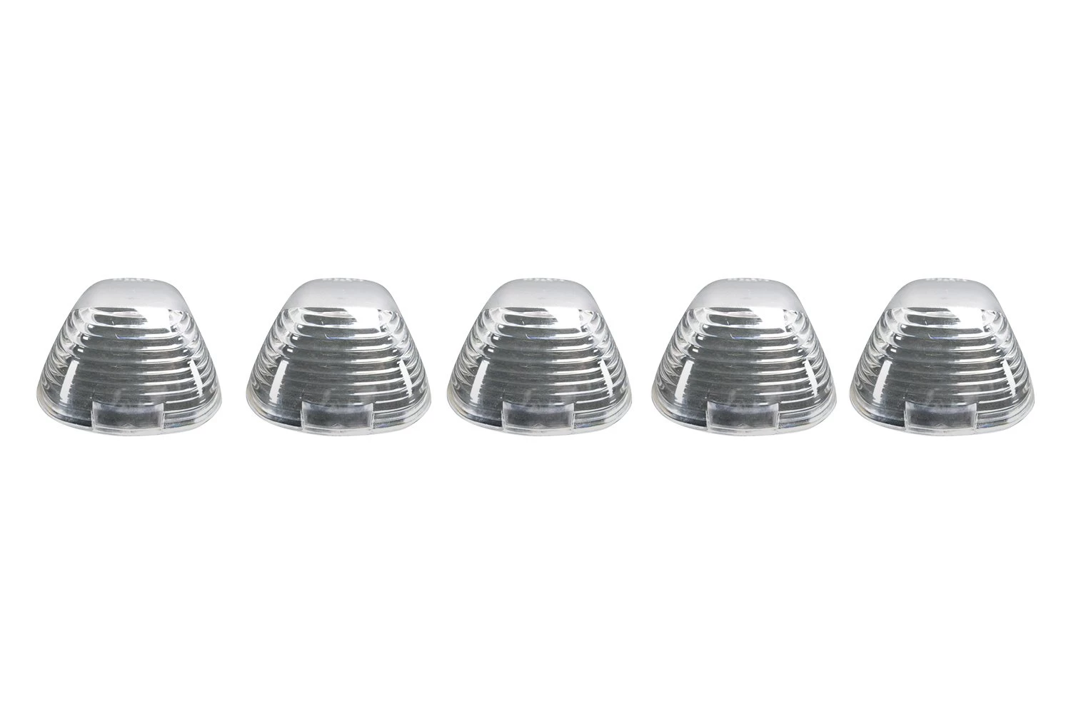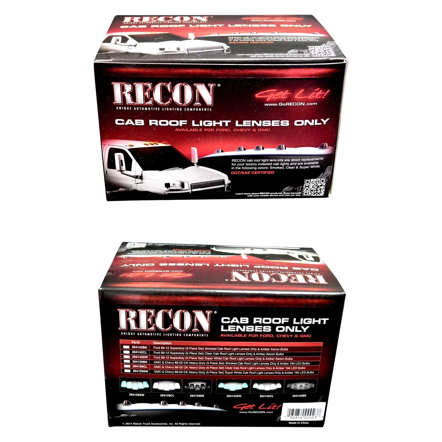 Crystal Cab Roof Light Lenses by Recon®. 5 Pieces. Clear lens. Wiring harness: not included. Bulb: amber xenon (included). The Recon cab roof lights are a direct replacement for your factory installed cab lights. This kit features extra strong ABS plastic protective lenses, which have been UV treated, so they don’t easily fade from prolonged exposure to direct sunlight. The lights come with all you need to replace your factory installed cab roof lights in no time flat.
