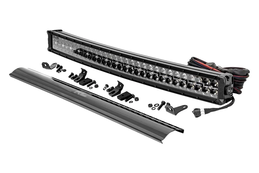 Universal Black Series Curved Dual Row Combo Spot/Flood Beam LED Light Bar by Rough Country®. 1 Piece. Black housing. Die-Cast Aluminum. Command the Dark: Stay out later on the trails with Rough Country’s 30″ Dual Row CREE LED Light Bar. With a powerful 27,000 Lumens and 300 Watt output, this LED light is a sight to behold.