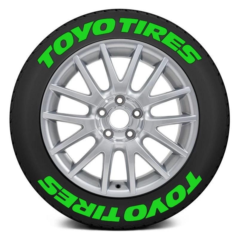 Universal Green “Toyo Tires” Tire Lettering Kit (TOYTIR-1718-1-8-G) by Tire Stickers®. Wheel Size: 17″-18″. Decal Height: 1″. Quantity: 8 Decals. Location: Top and Bottom. Type: Permanent, Rubber Lettering. Permanent Tire Stickers are designed for the most demanding conditions and to last the lifetime of the tire. Raised rubber lettering style Tire Stickers are ideal for maintaining a high quality look and lasting bond under daily driving conditions. This tire letter kit provides a durable bond and quality appearance lasting the lifetime of the tire, perfect for daily drivers. Kit is fully cleanable even after 40,000+ miles of intense driving. Each Raised Rubber Letter Kit includes a specially designed tire adhesive and instructions for application and removal. This top-grade product is expertly made in compliance with stringent industry standards to offer a fusion of a well-balanced design and high level of craftsmanship. Manufactured from industry-leading materials using up-to-date equipment, it ensures everlasting reliability and enduring value. This product is distinguished by total quality assurance, unsurpassed by anybody else.
