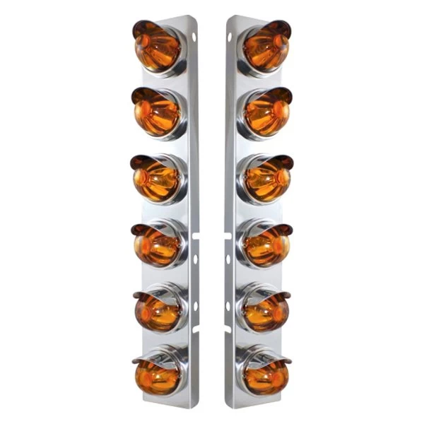 Front Air Cleaner Chrome Amber Parking Lights with 12 x Glass Watermelon Lights (30999) by United Pacific®. 1 Pair. Amber lens. With Stainless Steel Bracket. Location: front air cleaner. With Stainless Visors. This product is made of high-quality materials to serve you for years to come. Designed using state-of-the-art technology and with customers in mind, this product by United Pacific will last a lifetime. It will meet your needs and deliver great quality at an affordable cost.