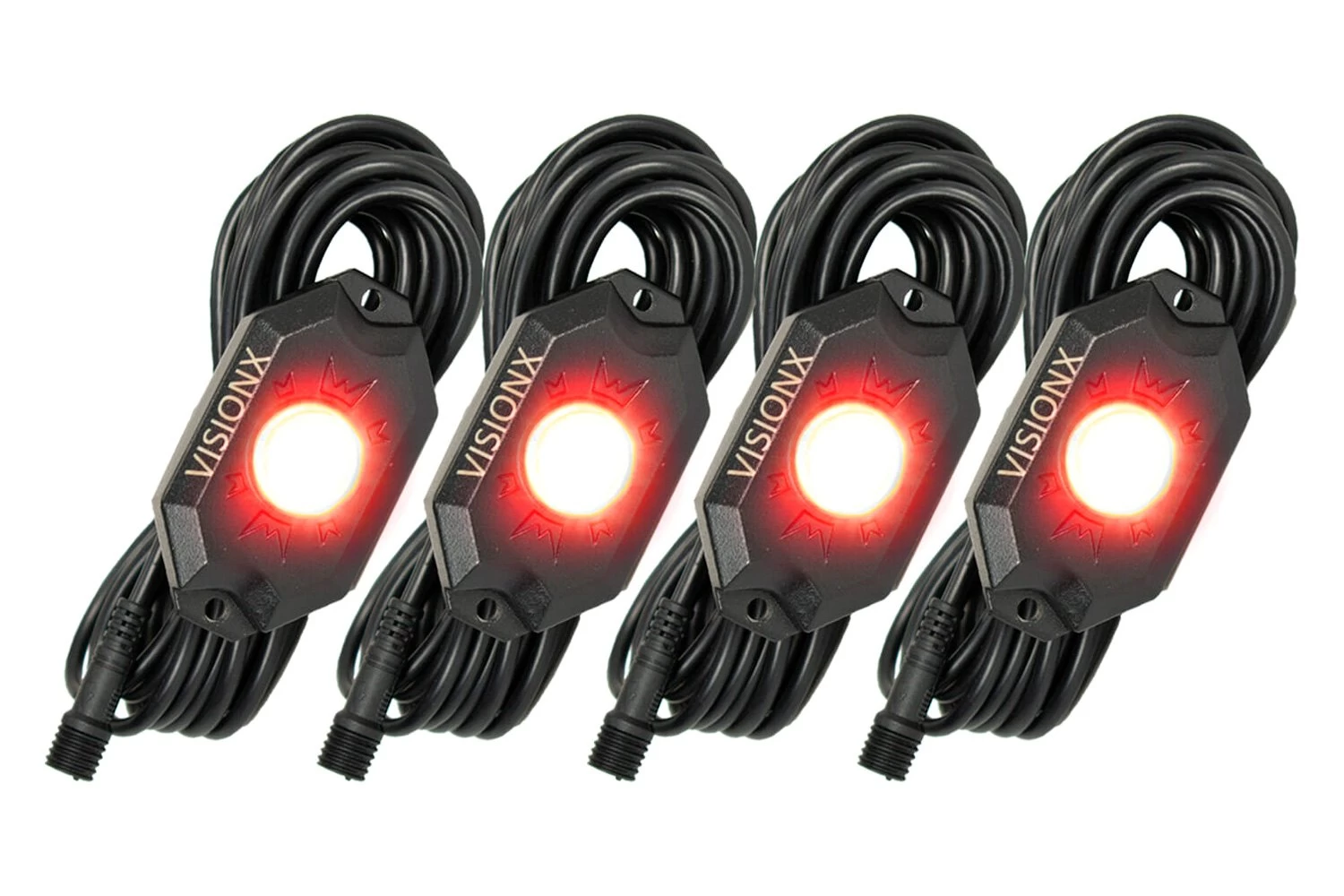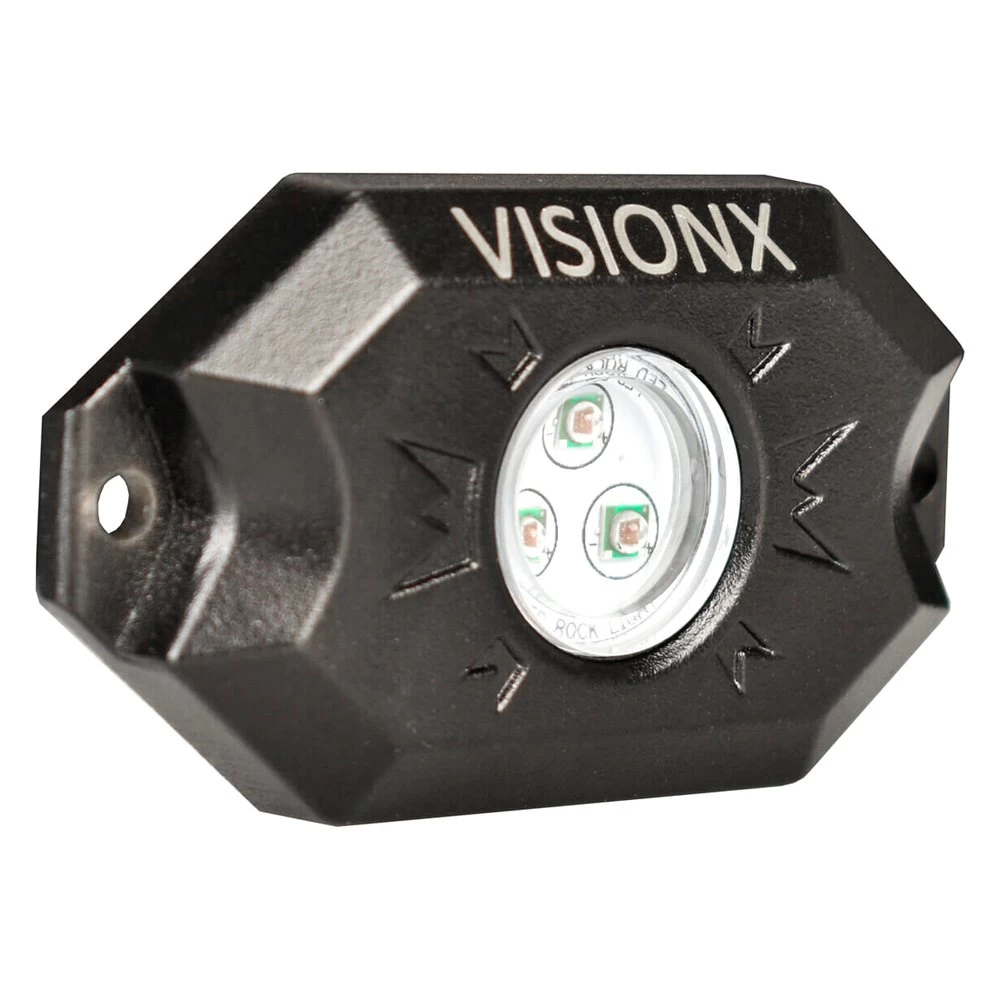 Universal Red LED Rock Light (9929347) by Vision X®. 4 Pieces. 36W. The new Vision X LED Rock Light Kits feature 9 Watts per Pod of earth blazing light. Mount these waterproof LED underbody Lights in your wheel well, in front or behind each tire to gain the best visibility and style. Each kit comes with a Flat mount and Tube Mount base for each pod to aid an easy installation. The Supplied Control box allows for easy connection and wire routing without cutting and splicing each Pod lead.