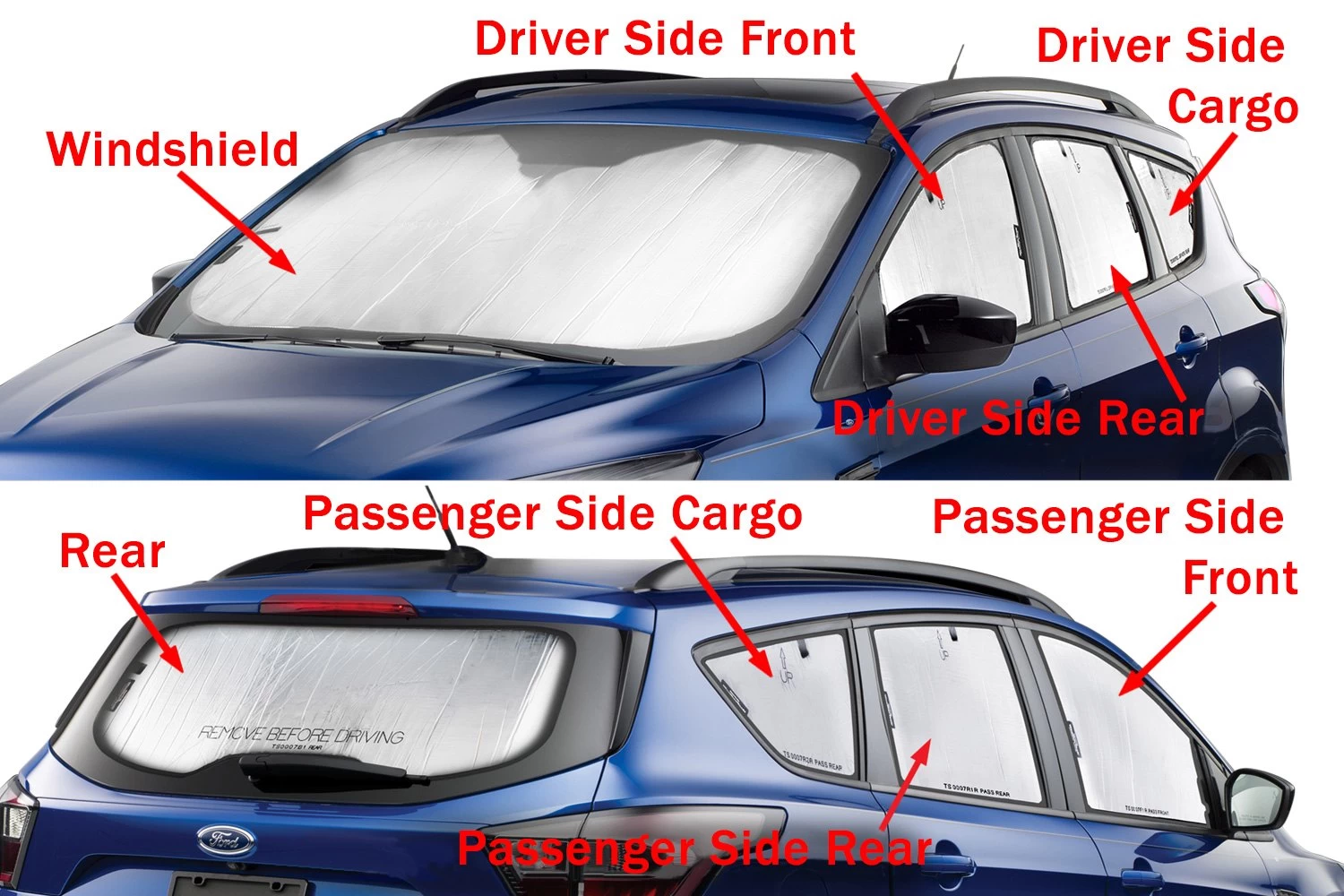 Full Vehicle Sun Shade Kit (TS1457K1) by WeatherTech®. Color: Silver/Black. 8 Pieces. Includes: windshield sun shade, 6 side window sun shades, and rear window sun shade. SunShade is custom fit for your vehicle’s windows to keep harmful UV rays from ruining your interior. Its dual-purpose design helps keep vehicles cool in the summer, and in the winter, also helps warm up interiors and avert frost build-up.